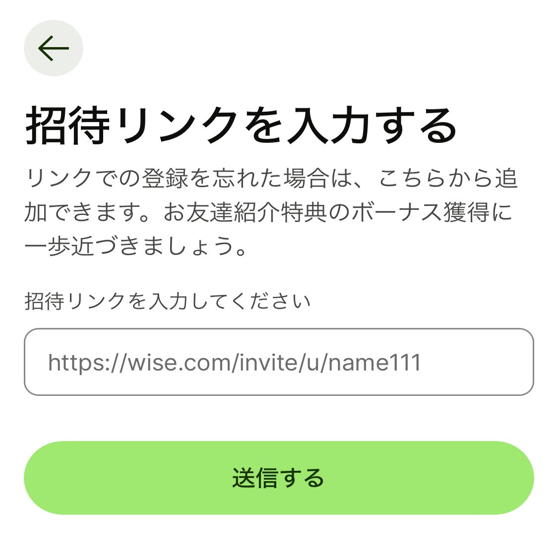 ここで、一番最初にコピーした招待リンクを「https://wise.com/invite/ihpc/misatot113」を入力して「送信する」をクリックします。