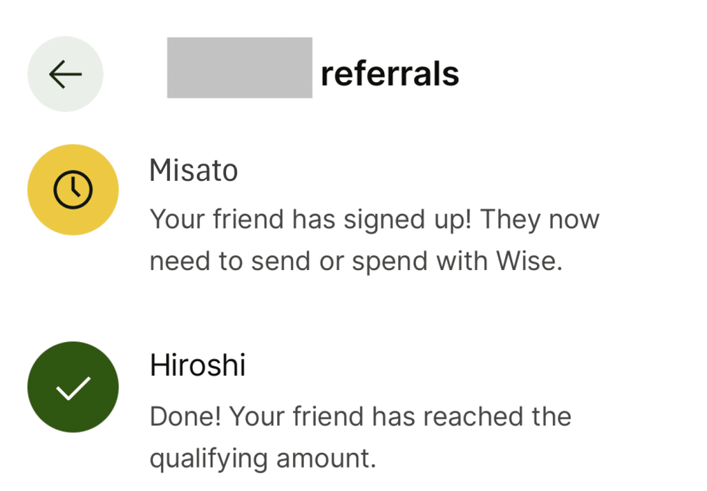 Wiseの友達紹介で紹介者側(私)に表示される情報は、ローマ字で下の名前(または稀に「*」でマスキングされたメールアドレス)が表示されるのみです。